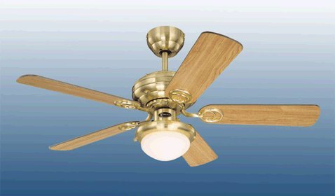Ø 105 cm / Gehäuse: Messing seidenmatt / 5 Wendeflügel: Ahorn und Mahagoni integrierte Deckenlampe mit Opalglasschirm > Abkühlung im Sommer > Heizkosten-Reduzierung im Winter (durch Winterbetrieb) > Ganzjährig ein angenehmes Raumklima
